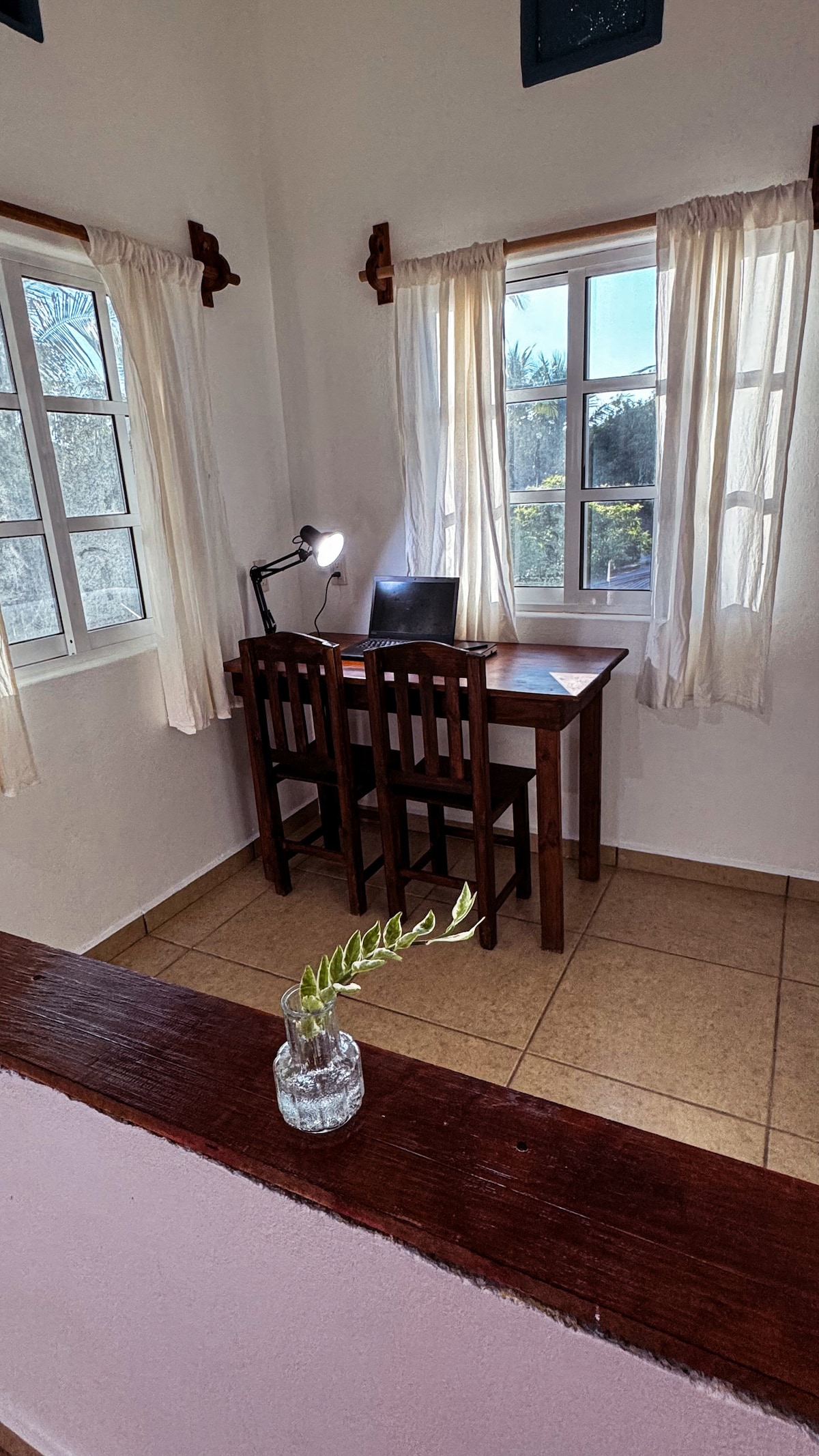 Beautiful room with a beautiful tree inside. We wanted to rescue it so if you like nature this room is ideal for you. It has 2 fans, one ceiling fan and one floor fan, air conditioning and a small minibar; the bed is a double memory foam bed. Bathroom and shower outside. Not shared with anyone. We have Starlink internet. Pd. We do not have hot water.