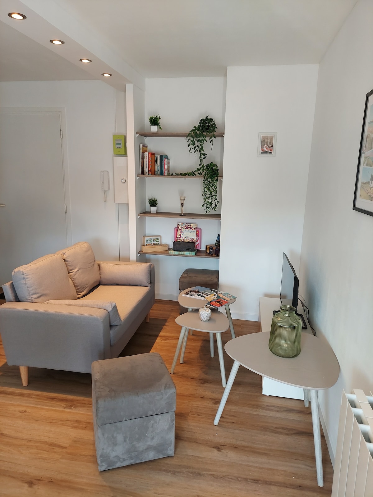Beautiful 2-room apartment in Ploemeur KERROCK on the first floor of a small 3-unit residence, comprising a living room with sofa bed, a bedroom, an AE kitchen with oven, microwave, dishwasher, fridge, coffee maker, kettle, toaster... Shower room with washing machine, separate toilet, a shared 200 m2 garden with tables, chairs, barbecue. free parking space The sea is 50 m away, golf is 3 km away, coastal trails, bus is 50 m away Quiet, non-smoking accommodation