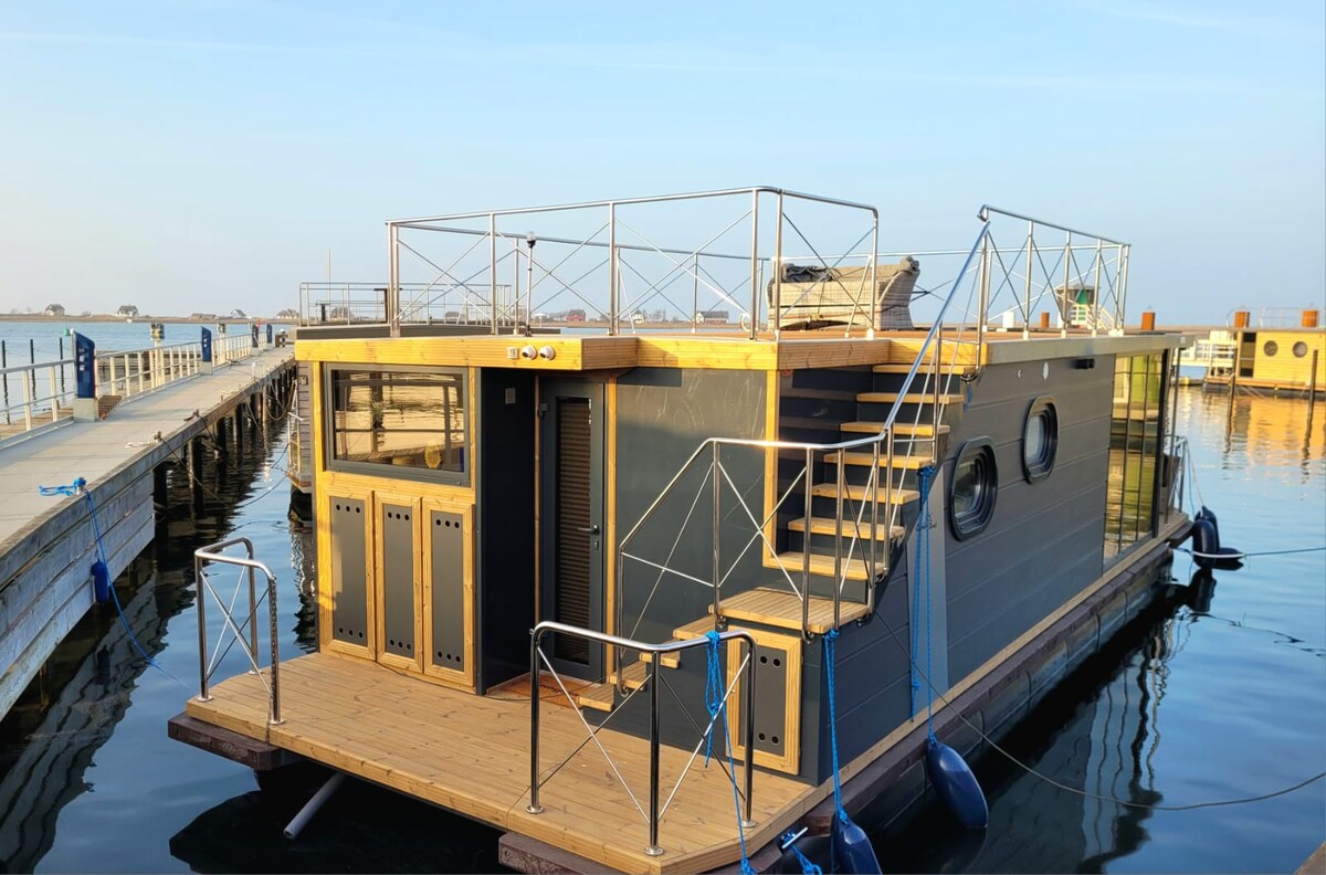 Exclusive houseboat in a fantastic location. Large panoramic windows flood the vacation home with natural daylight. You have a unique view of the Baltic Sea. On the terrace and the walk-in sky deck you can experience fantastic hours and sunsets. Underfloor heating and a private sauna guarantee a pleasant feeling of well-being even in winter months. The houseboat is equipped with designer furniture and offers its guests a lot of comfort overall.
