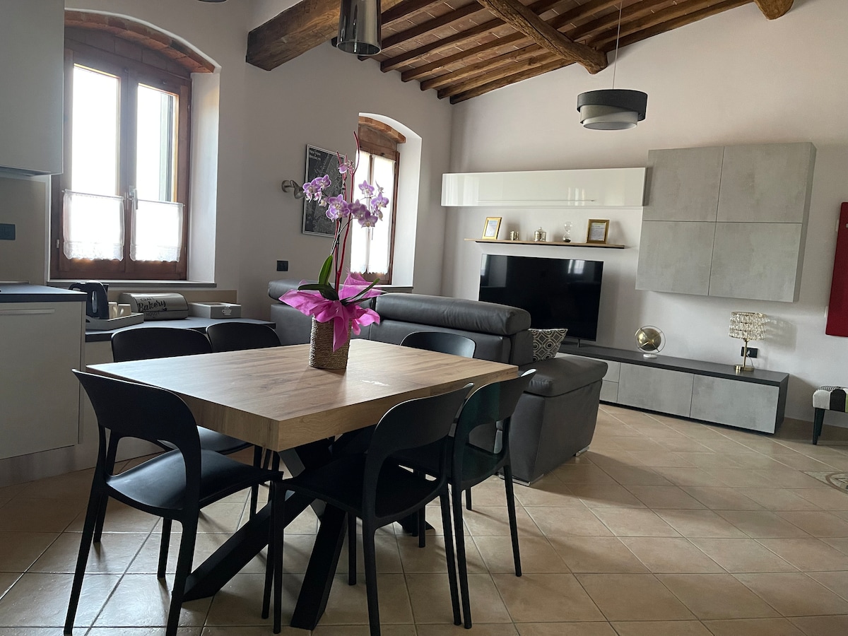 Ancient Tuscan barn renovated in 2005, 75 sqm. The house, fully furnished and independent, consists of a ground floor with a large living room (kitchen, refrigerator, dishwasher and oven), TV with satellite TV, a beautiful fireplace and a large wooden table and sofa bed, furnished with antique furniture in classic rustic Tuscan style. On the first floor: bathroom with shower and bedroom (double) with air conditioning.