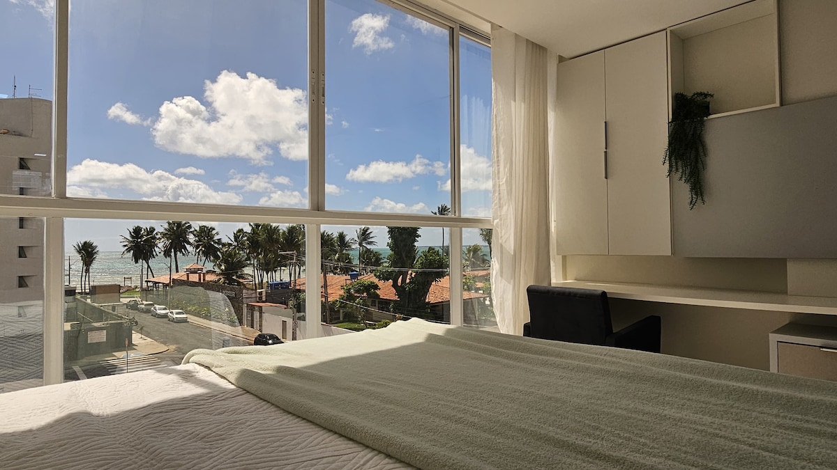 Seaside Flat Ponta de Campina Beach Cabedelo PB The space has air conditioning, TV, Wi-Fi, workspace, full kitchen, bathroom and a breathtaking view, literally! The building has an incredible leisure area, a beautiful swimming pool overlooking the sea, a gourmet terrace, a party room and a barbecue area. In addition to the location being privileged and close to bars, restaurants and conveniences. A real favorite among guests, it's worth the experience :)