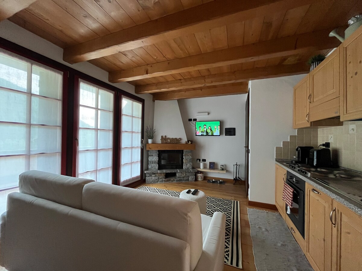 Bright two-room apartment in the historic center of Ponte di Legno with spectacular views of Castellaccio - 2-min walk to central square - 5-minute walk to the ski lifts. - Free private parking 2 minutes' walk away Casa Sofia has just been renovated and is equipped with all the comforts (WiFi, washer-dryer, dishwasher, TV, hairdryer, induction stove, combined oven, Nespresso machine, kettle). Ideal for two people, but can accommodate two more thanks to the sofa bed in the living room.