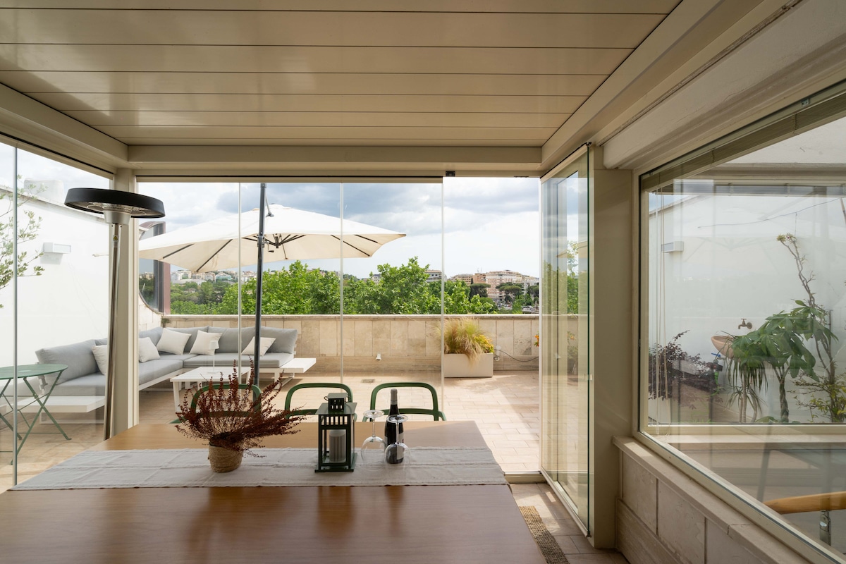 Be dazzled by the Roman light in this apartment with its light and dreamy lines. The attention to detail is reflected in the ability to harness the light between spaces and furniture, to make it smiling and cozy comfort. Seventh-floor penthouse of an elegant building located in Rome's center with a large terrace overlooking Monte Mario Park and from where you can admire St. Peter's dome. Ultra-fast wifi. No children Check-in 9 p.m./11 p.m. Extra €50. No check-in after 11 p.m.