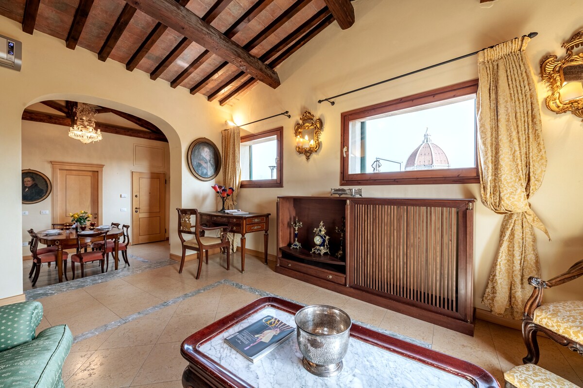 We are in the Oltrarno, the heart of Florence, an exclusive location next to one of the most historical and famous places in the city, the "Ponte Vecchio". The terraces of this penthouse offer suggestive views of the monuments and roofs of Florence making it unique. Its exceptional central location is within walking distance to all major attractions. For example, from the Santo Spirito district just cross the Ponte Vecchio and in 5 minutes one can be at the Duomo or the Uffizi.