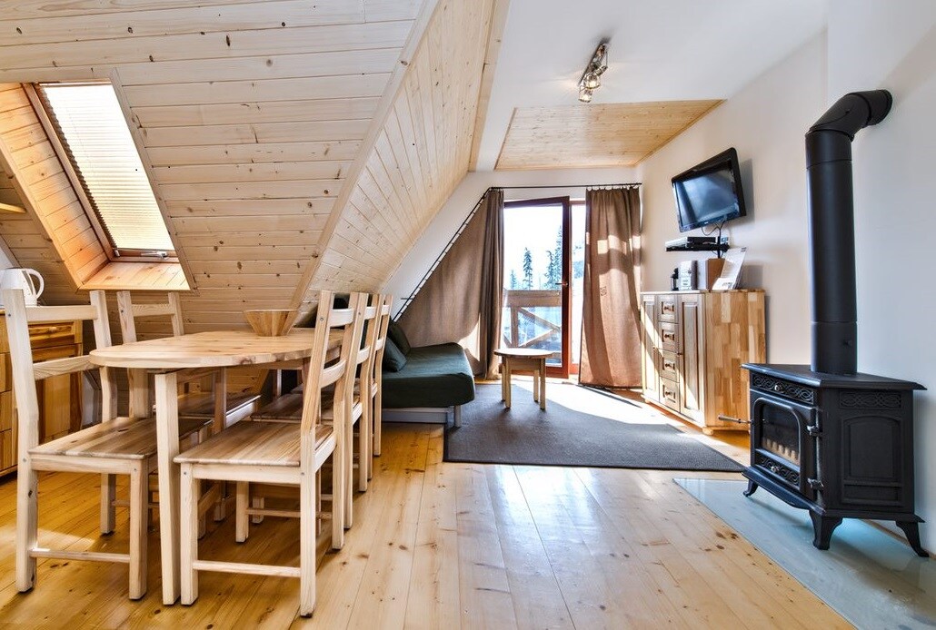 Wakacje w luksusowych warunkach? Oczywiście! Dwupoziomowy apartament z antresolą pełniącą funkcję sypialni spełni te wymagania. Usytuowany na pierwszym piętrze Tater Chaty, posiada osobną łazienkę z podgrzewaną podłogą i w pełni wyposażony aneks.