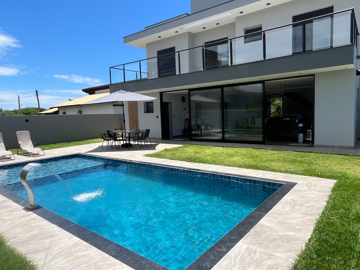 New, beautiful and decorated house, with a suspended pool (safer for children and pets). In a condominium with 24-hour security. The area has 3 bedrooms, 3 bathrooms, 1 full kitchen, 1 living room, gourmet area equipped with utensils, 3 TVs (with apps for series and movies), appliances, laundry and a spacious backyard with 3 hammocks available for relaxing. All bedrooms have air-conditioning.