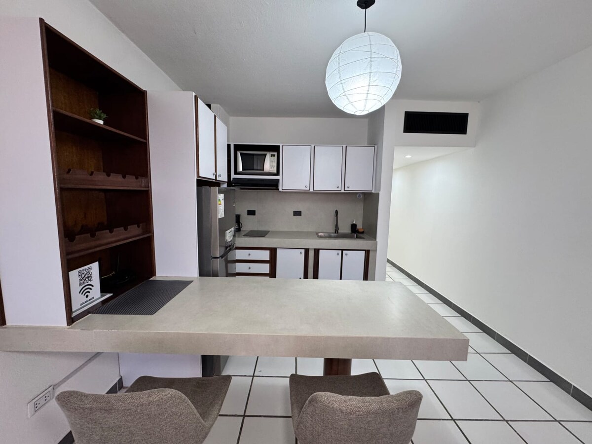🎁 Exclusive offer. Book 7 nights and pay for only 6. The 7th night is complimentary. Enjoy a stay in this cozy suite, just steps from Bay Side Beach and the beautiful La Vela shopping center, with a lovely view of the marina 🚤 and the ocean 🌊 Extremely equipped Wi-Fi 400 Mbps • Smart TV. • AC • Equipped kitchen: microwave, toaster, blender • Washing/drying machine • Hair dryer, iron • Linens and beach towels included • Water service 💦 every day • Parking/surveillance