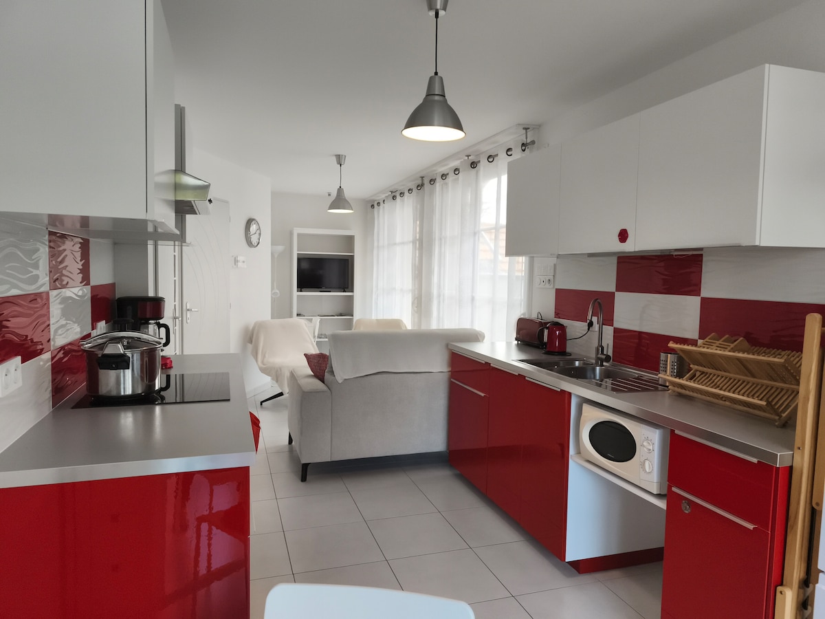 Beautiful 70 m² townhouse located in the heart of Pornic, market (2 min), port (5 min), train station (10 min) and beaches (15 min) on foot. Accommodation with 2 bedrooms, 1 shower room with toilets, 1 bathroom and separate toilet, shared terrace. The kitchen is fully equipped (coffee machine, kettle, oven, dishwasher, toaster...). You also have a washing machine. Ample parking beside house. Great for a family vacation!