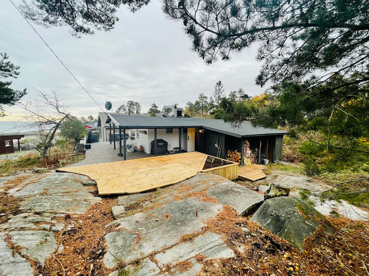 Unique and modern nordic design. idyllic and undisturbed surroundings in harmony with nature. Panoramic view over the fiord. 20 min. from Sandefjord/1,5 hour from Oslo/1,5 hour from Kongsberg alpin. The beach in front is Bronnstadbukta, area with rich nature, perfect for adults and kids. Great hiking right outside, with numerous popular summit hikes and hiking trails. Beautiful fjord with islets and reefs if you travel by boat. Cabin also suitable for two families with 2 baths ans 4 bedrooms.