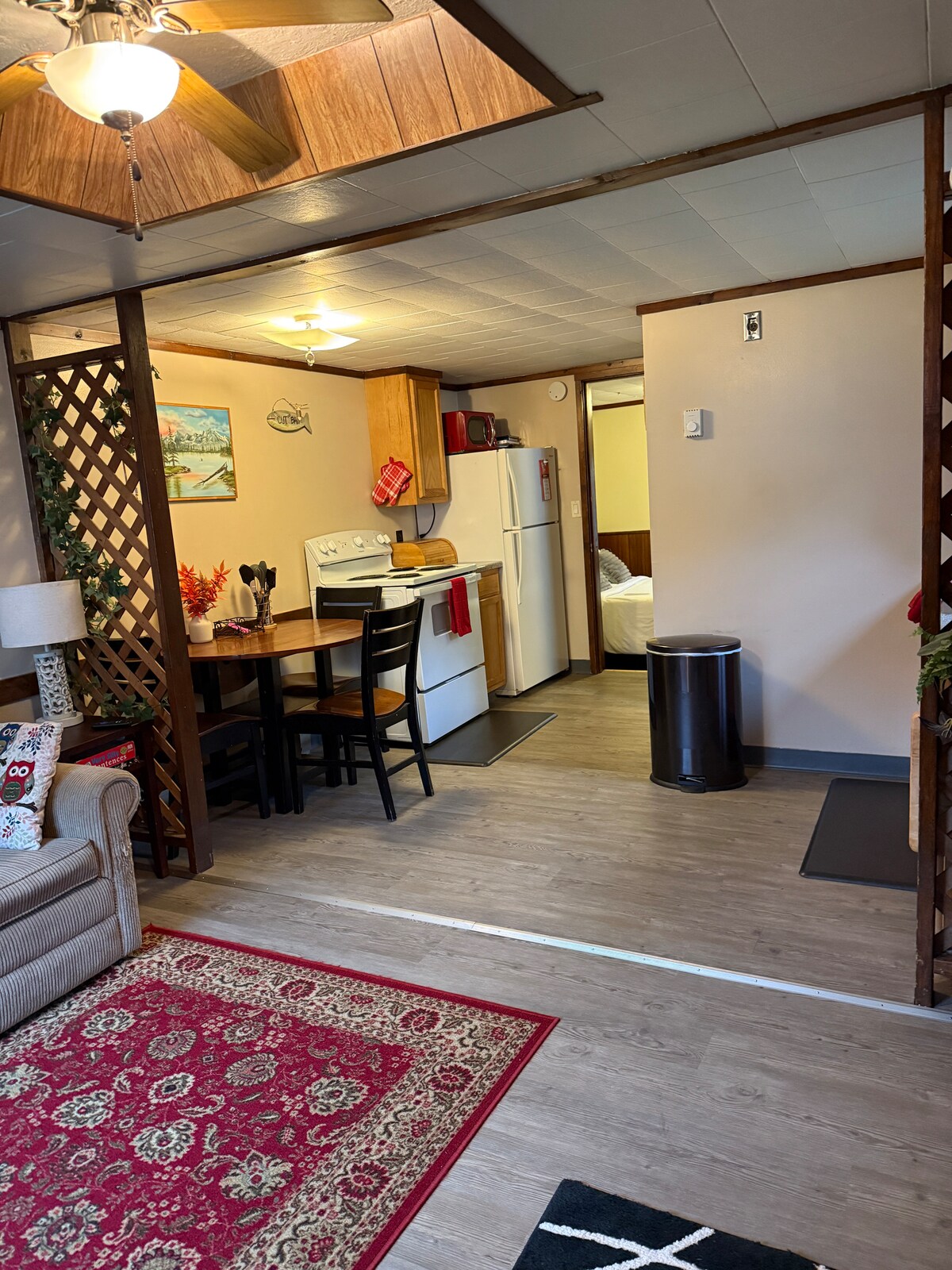 Newly constructed single bedroom apartment overlooking the Salmon River. Kitchen includes 4 burner electric stovetop, microwave, air fryer, toaster, Keurig, refrigerator/freezer and dishwasher, utensils. Swing mount TV in the living room area as well as a TV in the bedroom. Island dining table with 4 chairs. Bedroom offers a queen bed and queen size sleeper sofa in living room. Fully furnished with dishes and linens. Will provide linen exchanges/cleaning during extended stays.