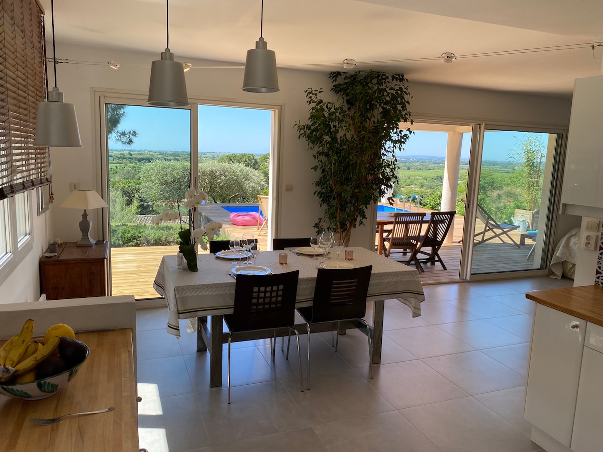 In a neighborhood nestled in the heart of a pine forest, we welcome you for your holidays with family or friends. On the heights of the village, the brand new and air-conditioned apartment enjoys a beautiful view of the sea and offers all modern comforts. It is located on the ground floor of our family home, with an independent entrance accessible by a staircase. Located a few steps from the Canal du Midi, shops and 5 km from the beach. Multiple tourist attractions throughout the year.