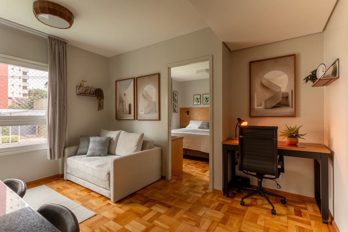 Studio with park view and automation/Alexa. Closed garage, kitchen with basic items and bed/bath linen. Located in a central area, rooftop with swimming pool, gym and coworking. Parque da Redenção a few meters away, Organic Fair and Brique on weekends, Refúgio do Lago gastronomy and concerts at the Araújo Vianna Auditorium. Close to the bars, restaurants and nightlife of the Cidade Baixa/Bom Fim neighborhoods. Easy access to the Guaíba Riverwalk, universities, hospitals and other neighborhoods.