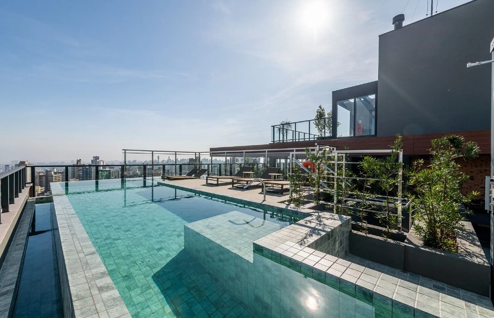 The LIV terrace has a breathtaking view of the entire city, as well as an outdoor pool with an infinity edge, fitness area, gourmet space, hammock area, laundry area, meeting room, coworking, pool table, ecological fireplace and super comfortable swings, and a cafeteria at your disposal, in addition to hotel services and 24-hour concierge.