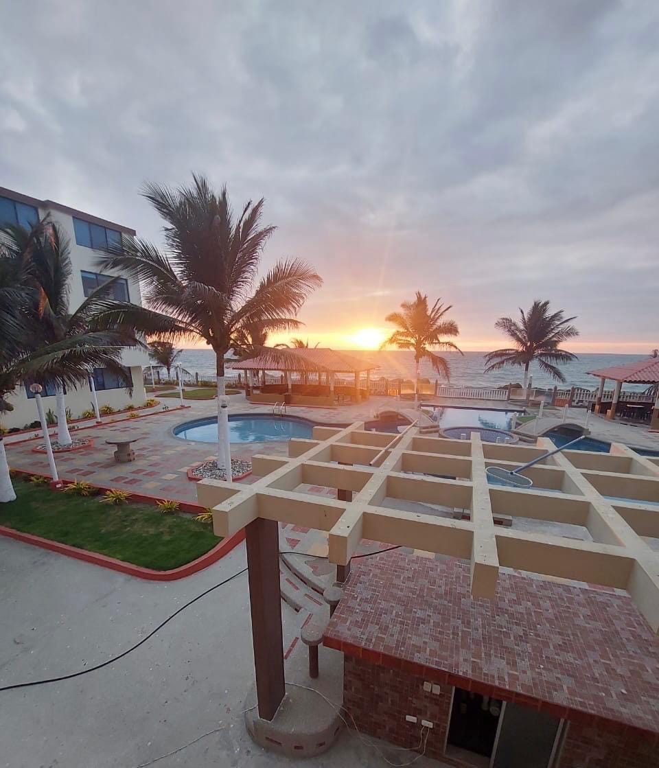 Oceanfront. Wide and extensive ocean view. Abundant nature, birds and marine crabs. 800 meters from the new tourist pier and the mouth of the Portoviejo river in the sea with mangroves and food services. Large swimming pool with a viewpoint. Quiet without noise. Plenty of contact with nature and pure marine air. Fully furnished apartment with premium finishes, air conditioning and TV. Ideal for resting and water sports