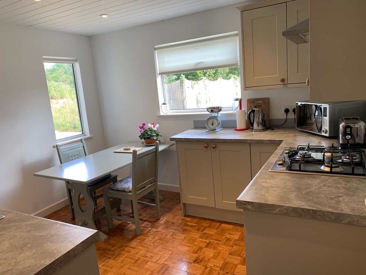 Our Cabin offers a cosy independent stay with a fully equipped kitchen, lounge, bedroom with super-king bed, luxury en-suite shower and utility with additional toilet. This eco friendly home has air sourced underfloor heating throughout and contains many upcycled items from the exterior reclaimed scaffolding boards to the many repurposed gems to be found inside. Stepping outside there is a private south facing patio and garden with its own parking space, all just a leisurely walk from town.