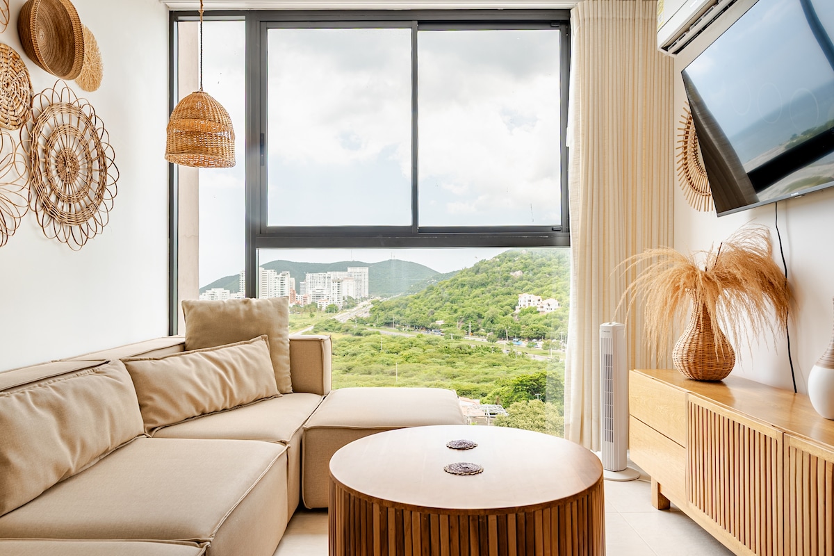 Relax in a unique and quiet getaway with ocean views and a private Jacuzzi inside the luxury apartment suite, enjoy a 70-inch TV and an equipped kitchen. Located in an exclusive condominium hotel in the tourist area of Santa Marta, just 3 minutes' walk from the most beautiful beach in Bello Horizonte, ideal for couples or 3 or 4 people: Queen bed luxury mattress + Queen nest. Free daily cleaning. Enjoy a 5-star hotel and experience something different. Book now!