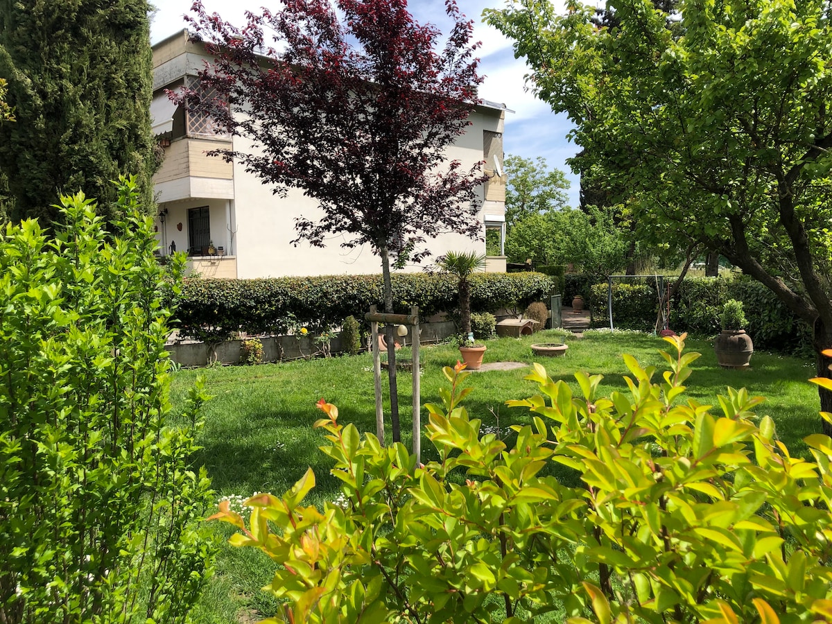 Description of the apartment The apartment is 85 square meters big and is accessible through a vast internal yard. It has all the facilities and is well furnished. The kitchen has a dishwasher and a microwave. Each of the 2 rooms has a bathroom with a shower and tall windows that give luminosity to the interior. A windowed door of the living room leads to a beautiful private garden that has a barbecue grill. At the back of the garden there's a verandah where's placed a washing machine. The apartment is provided with heating, air conditioner, wi-fi internet, satellite tv and a dvd player. The location Il Giardino incantato (The enchanted garden) is situated in Certosa, Florence, at the entrance to the city, and is surrounded by green and peaceful tuscan hills and a vast garden of about 5000 square meters. The city centre is conveniently reachable by bus. We are close to the Certosa monastery that is famous for its history as well as for its art, in particular the works of the italian painter Pontormo. Besides, we are just few kilometers away from the center of Imprunetta, a town famous for its terracotta art. There are also some important sights to visit for example the Sanctuary of Santa Maria Maggiore. Imprunetta is an area of olive trees plantations and wine yards so there you can find locally produced wine and olive oil of the finest quality. How to reach us The Giardino incantato (the enchanted garden) is happily located just 100 meters away from the A1 highway (exit Florence-Certosa) and from the entrance to the Florence-Siena road. At about 150 meters there's a bus stop of the line 37 that goes directly to the Florence main railway station Santa Maria Novella as well as of the intercity buses that will take you straight to Siena and Grosseto. The airport of Florence Peretola is easily reachable by highway A1 (20 min. ride). Finally in our staff there is an official turistic guide of Florence, wich offers its services to guests at special rates.