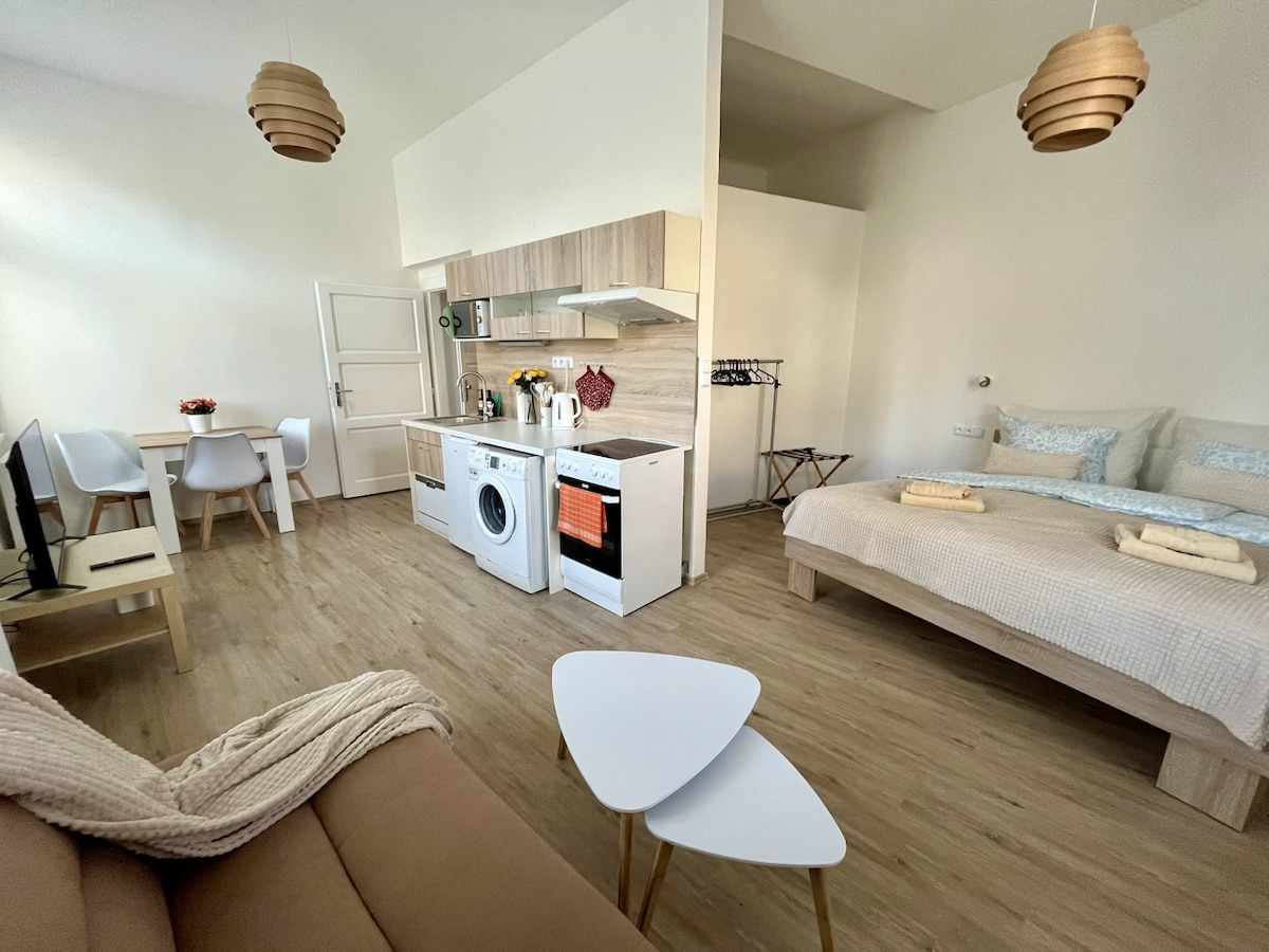 Discover the charm of modern living in our designer studio at the Hagibor complex! Enjoy the comfort of home with a fully equipped kitchen, Nespresso coffee maker, and relaxing book or Netflix evenings. With a balcony, garage parking, and fast internet, it's an oasis of calm in the bustling city. Just a short walk from Želivského metro station on the green line, you're moments away from the historic city center. The perfect place for your urban adventure!:-)