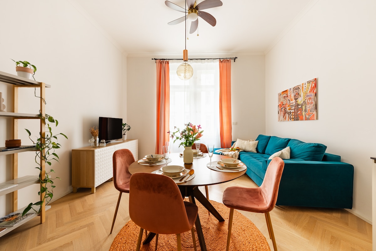Spacious and light place with unigue views in old residatial neighborhood. Luxuriously furnished apartment offers comfort at every moment of your stay. Fully equipped kitchen, bathroom with shower and bathtub with a breathtaking view, TV with Netflix, quiet bedroom with a comfortable bed. Cafes, bakeries and bistros, pubs with the best Czech beer and cuisine, a local market right next door. Direct public transport to the airport, train station, Prague Castle, Old Town Astronomical Clock.