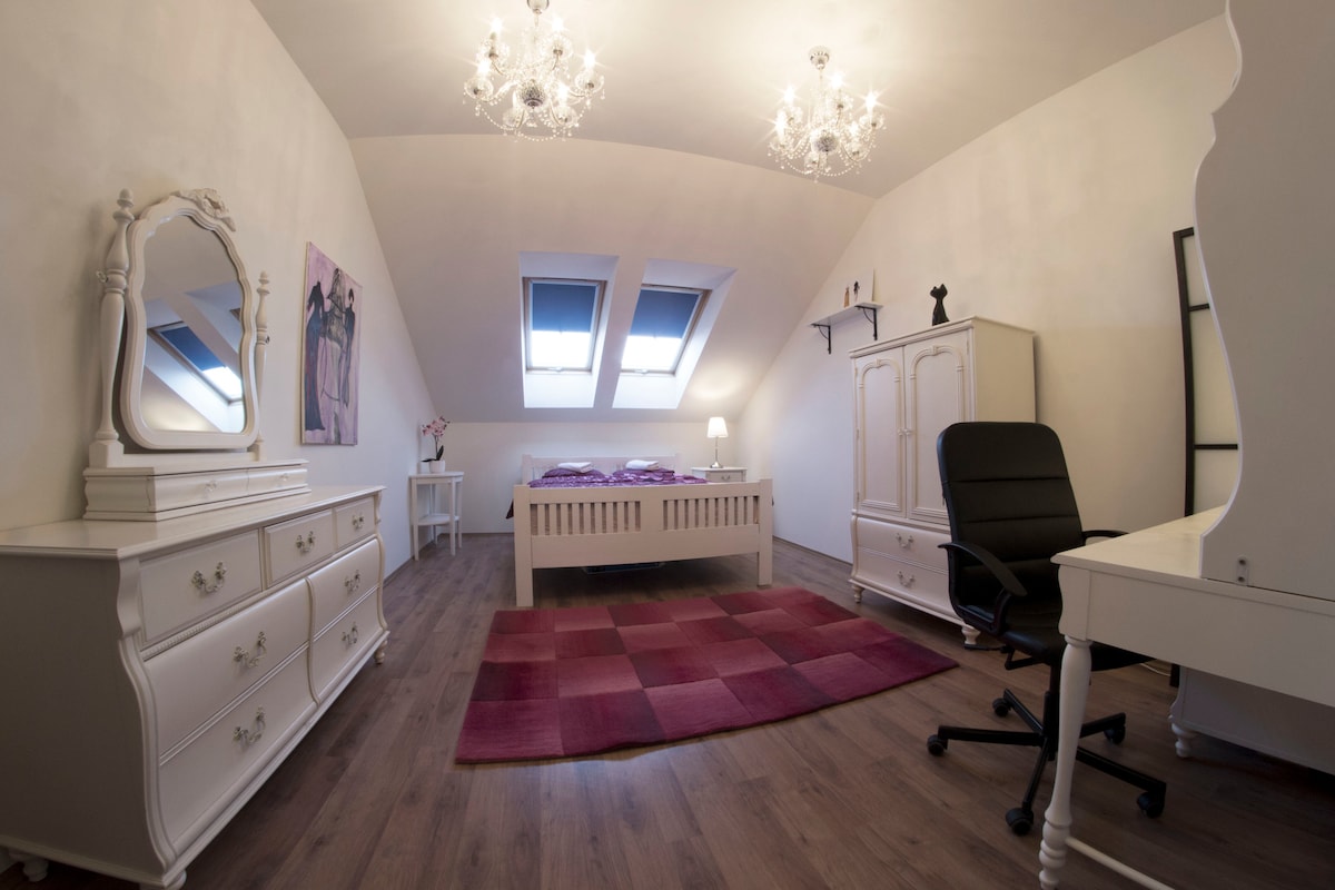 Spacious and light place with unigue views in old residatial neighborhood. Luxuriously furnished apartment offers comfort at every moment of your stay. Fully equipped kitchen, bathroom with shower and bathtub with a breathtaking view, TV with Netflix, quiet bedroom with a comfortable bed. Cafes, bakeries and bistros, pubs with the best Czech beer and cuisine, a local market right next door. Direct public transport to the airport, train station, Prague Castle, Old Town Astronomical Clock.