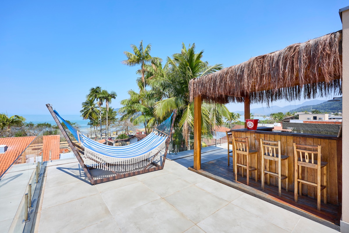 New house of high standard, in Praia da Lagoinha within the condominium in Salga in Ubatuba, with 24-hour security. In front of the beach, just cross the street, practically foot in the sand, near the famous trail of the 7 beaches! With 6 spacious air-conditioned suites, a hot water jacuzzi, a swimming pool, a full kitchen and an integrated gourmet area, with a barbecue and swimming pool. It has a terrace with stunning sea views. It has all home essentials, Wi-fi and streaming services.