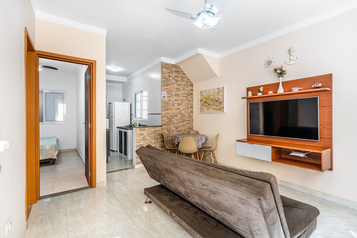 House in Praia Grande - Vila Tupi comfortable, with private and private garage. Environment with Wi-Fi, barbecue, hammock, sofa, rack and TV, air conditioning in the living room and bedroom Bedroom, 1 double bed, 2 bunk beds and 1 sofa bed in the living room. Bathroom with electric shower and mirror. Fully equipped kitchen with a fridge , stove , oven, cabinet and household utensils. Close to supermarkets, bakery, fuel station and general commerce. Your pet is more than more than welcome.