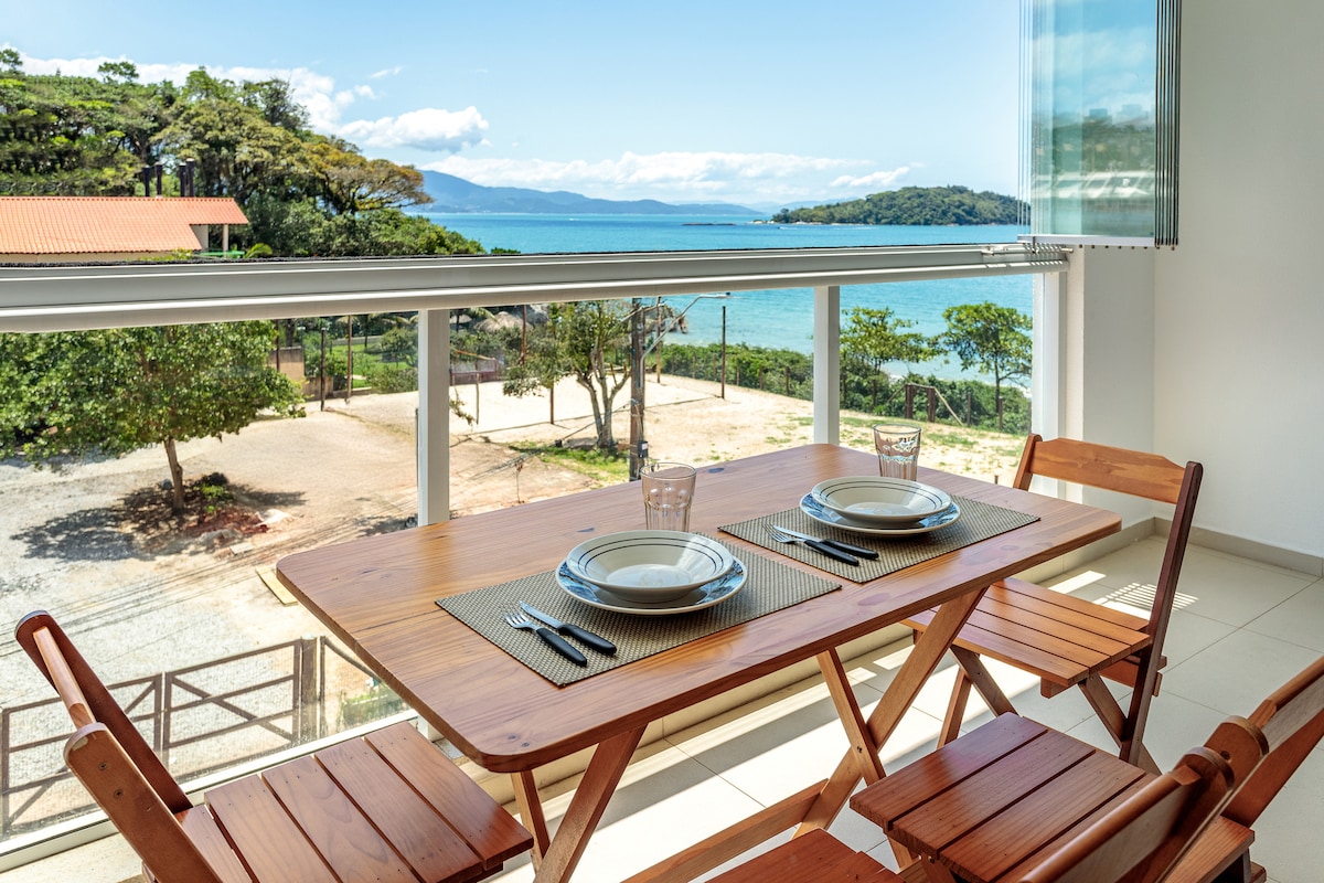 A beautiful view from the balcony to the white sands and turquoise sea of Canasvieiras. With one bedroom, the apartment is furnished and decorated to comfortably accommodate 4 people. Kitchen with basic equipment for cooking and eating. The building is located on the seafront, and the neighborhood's shopping center is two blocks away. You can follow artisanal fishing and buy fresh fish or take a ride on a pirate schooner. Many options for walking, fun and relaxation.