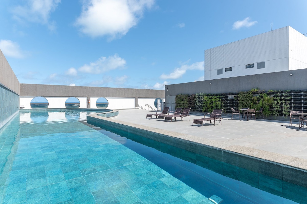 Modern and comfortable apartment with sea views, a rooftop pool, food court, gym, and laundry facilities. Located at Av. Dr. José Augusto Moreira, 900 — in Casa Caiada, Olinda. Just 50m from Olinda’s beach and 8 minutes from the historic center. In 15 minutes, you can be in Recife. An ideal location for relaxing or exploring the region. Free parking, fast Wi-Fi, air conditioning, and a climate-controlled environment ensure total comfort. Come enjoy an unforgettable stay by the sea!