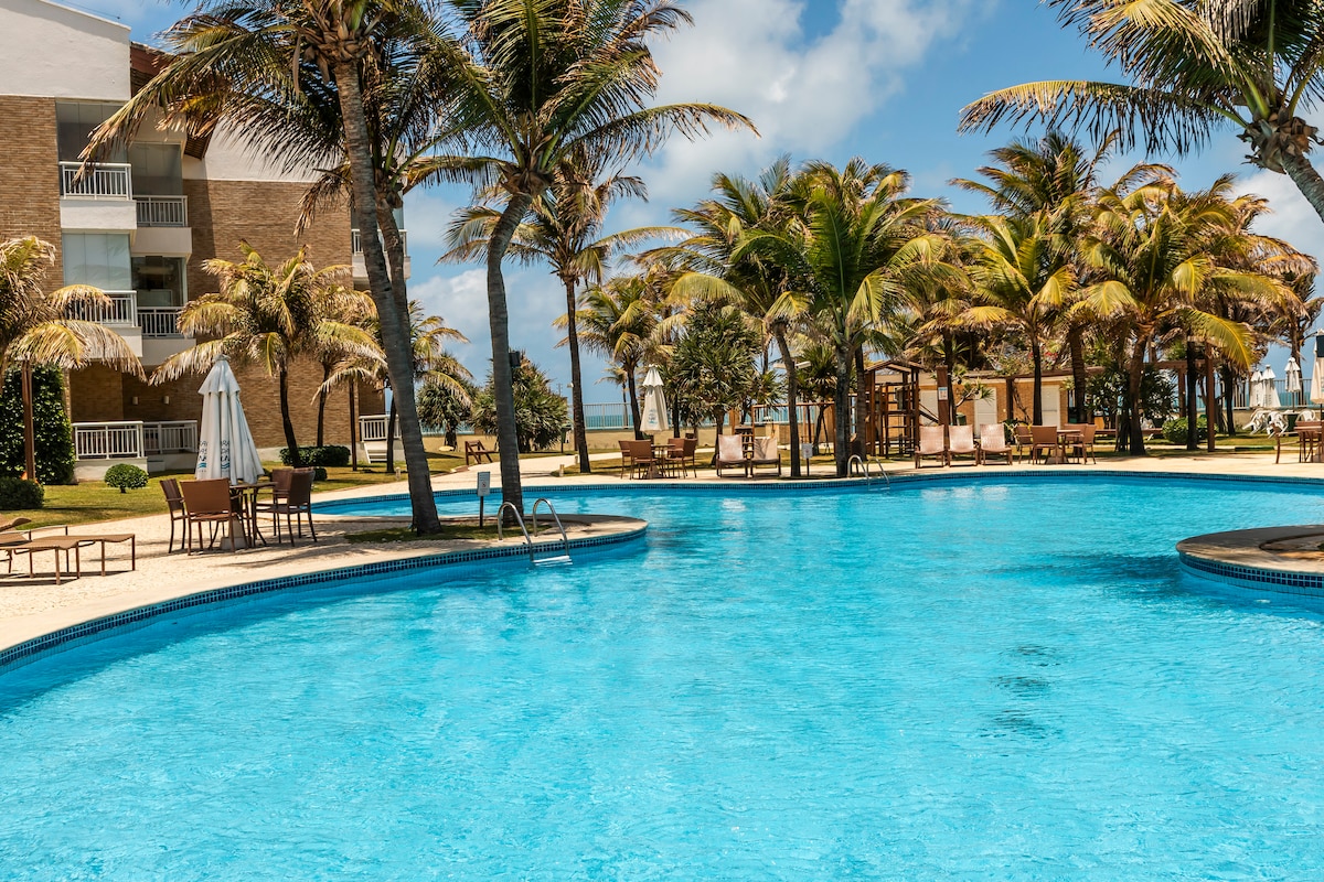 🌊 FULLY AIR-CONDITIONED APARTMENT WITH SEA VIEW OF PORTO DAS DUNAS BEACH! Enjoy the ocean view after a day of fun at Beach Park, which is just 5 minutes from here. ✅ SPACIOUS BALCONY overlooking the ocean 🚀 HIGH-SPEED WI-FI ❄️ FULLY AIR-CONDITIONED UNIT 👶 PERFECT FOR FAMILIES 🏢 ELEVATOR: Total comfort 🍹 COMPLETE RESORT LEISURE with direct access to the beach 🚗 2 GARAGE SPOTS