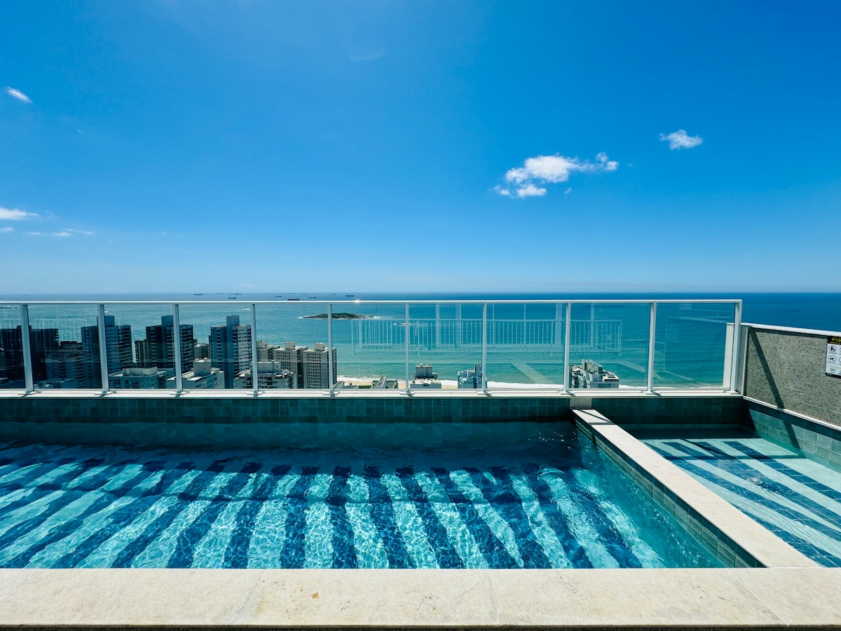 Cobertura com Jacuzzi e vista para o mar com teto solar. Muito espaçosa (65 m2). Melhor ponto da Praia da Costa, a melhor praia de Vila Velha! Cozinha totalmente equipada com utensílios diversos para bar, coqueleteria e taças finas. Suíte climatizada, confortável e aconchegante. Simplesmente a melhor experiência de hospedagem de Vila Velha! Sua estadia por aqui será perfeita! SÓ VEM !!!