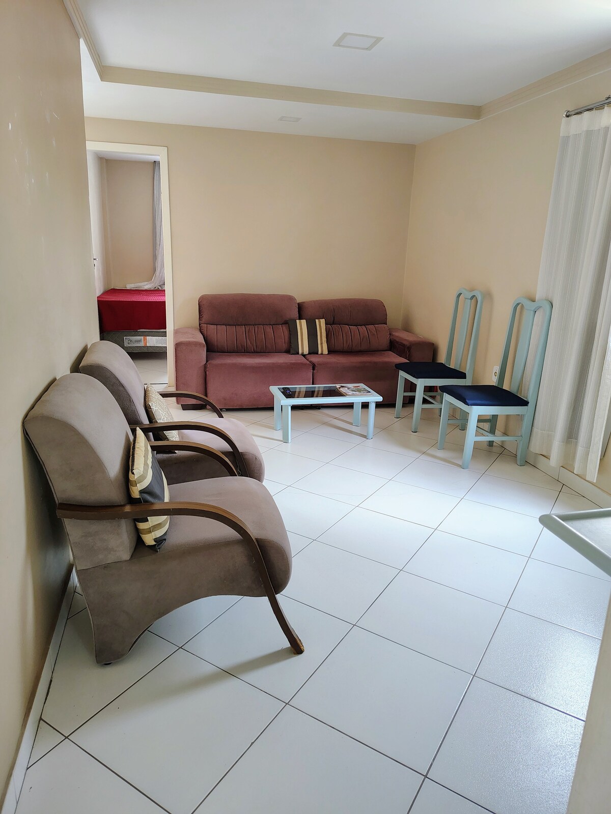 This excellent two-bedroom apartment has air-conditioning in the living room and bedroom, located a few minutes' walk from the beach and with a garage included. Located in the neighborhood of coqueiral de Itaparica, nearby we have several establishments such as bars, shops and supermarkets. The property is just 1.3 km from Shopping Vila Velha, a landmark mall in the city. It is just 500 meters from Itaparica Coconut Grove Square