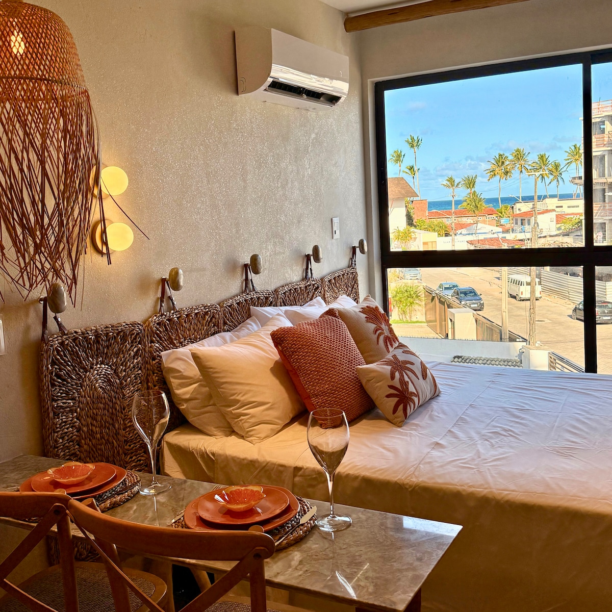Nui Supreme Beach Living 2-bedroom flat (64m2) equipped, furnished and decorated in a high-end private condominium on the seashore of the calm and warm waters of the paradisiacal beach of Muro Alto. Comfortable for 6 people, the apartment has the best view and relaxation experience in the region. Umbrellas, beach chairs, bed linens, bath linens and mineral water are available free of charge. The village of Porto de Galinhas is just 12 km from NUI (approximately 19 minutes).