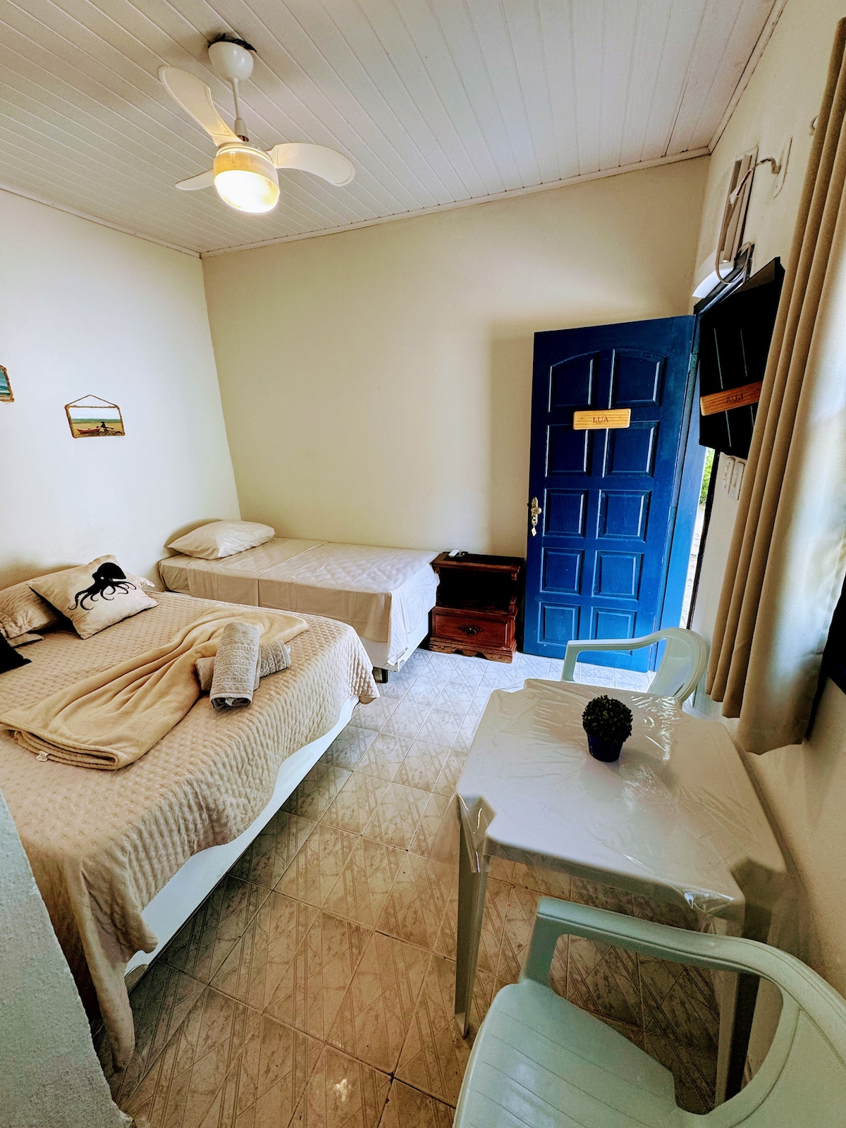 The best location!! Central and a few steps from Abraão beach. Suite with kitchen, outdoor area with shower and barbecue, all private. Unmissable!!! TV, Wi-Fi, 1 double bed and 1 super cozy single bed (we provide bed and bath linens), split inverter air-conditioning and ceiling fan. Entry is individual . Ideal for couple and/or couple with children due to the circulating space of the dormitory. Perfect to relax and enjoy the best of Ilha Grande.