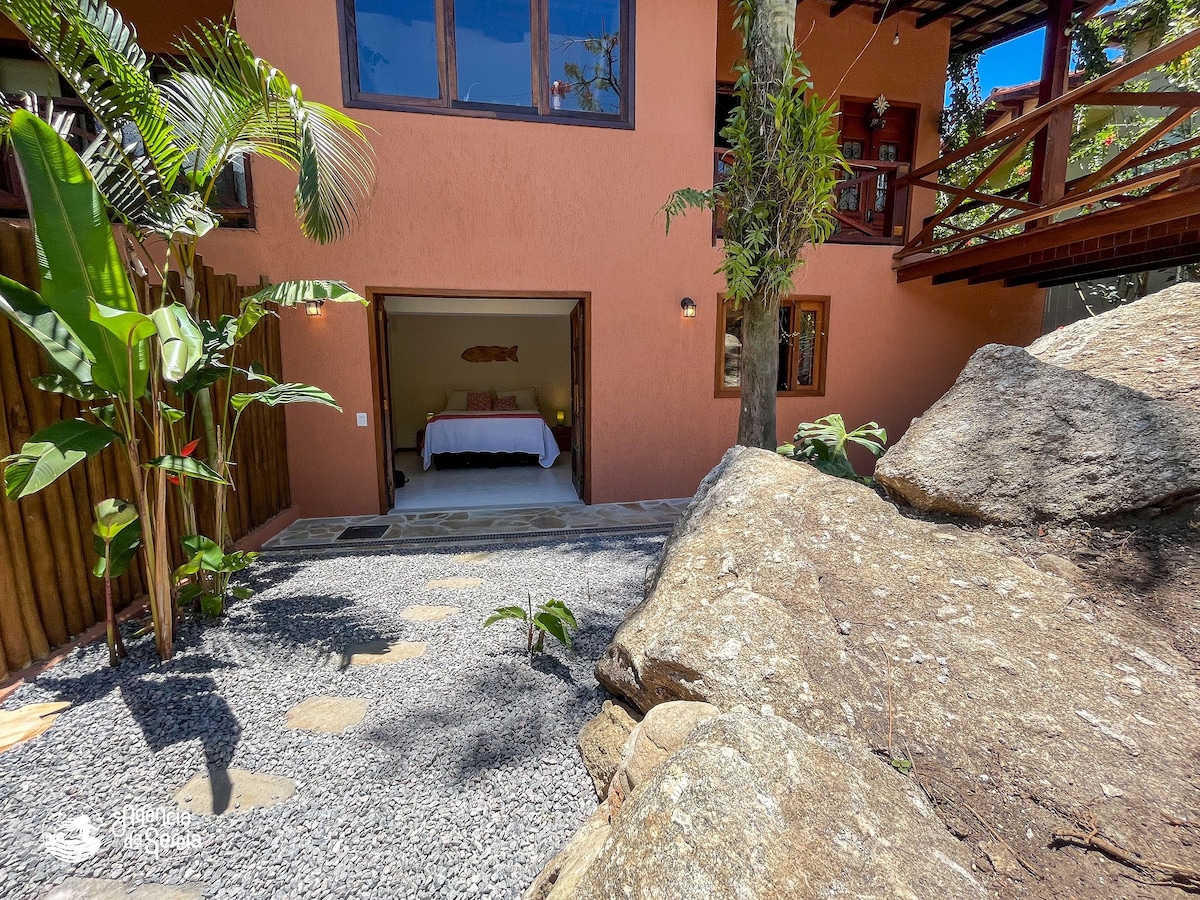 Escape the routine and relax in a private chalet surrounded by nature, perfect for couples💑. Enjoy an exclusive heated Jacuzzi, king-size bed, air conditioning and barbecue area, all just 500 meters from the beach. Amazing location in the south of Ilhabela: close to the most beautiful beaches, restaurants and market, but with the tranquility of a refuge in the woods 🌿🌊 The chalet has: • 1 bedroom • 2 Bathroom • Private kitchen • Wifi • Smart TV • Jacuzzi to relax. • Private BBQ