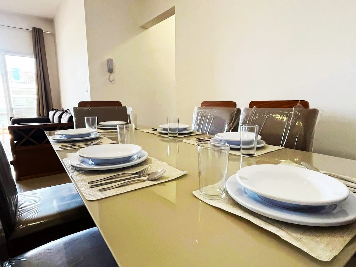 Apto135m², grande, bonito, confortável, arejado! Bem localizado. Apenas 12 aptos o que evita aglomeração. 3 quartos, 1 suite com TV smart e varanda. Camas : colchão Castor de primeira linha! Ar condicionado nos 3 quartos e sala Varanda gourmet grande com churrasqueira privativa. 2 garagens! Sala 3 ambientes, TV Smart 65 polegadas! Cozinha equipada! Piscina, sauna! Brinquedos de praia, cooler, kit de papel higiênico, sabonete. Prédio monitorado por vídeo câmeras e alarmes. Ambiente familiar!