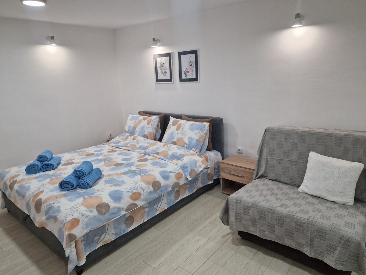 A cozy apartment decorated with lots of flowers and plants, spacious and you will enjoy easy access to everything from this centrally located place. The apartment is only 5 minutes away from the main pedestrian street and all of the main cafes and restaurants and just 2 minutes away from the main bus station. It is warm and cozy with 1 separate room, spacious living room, dining room, a fully equipped kitchen, a bathroom and 2 balconies. From 1 balcony you have a great view of the neighborhood.