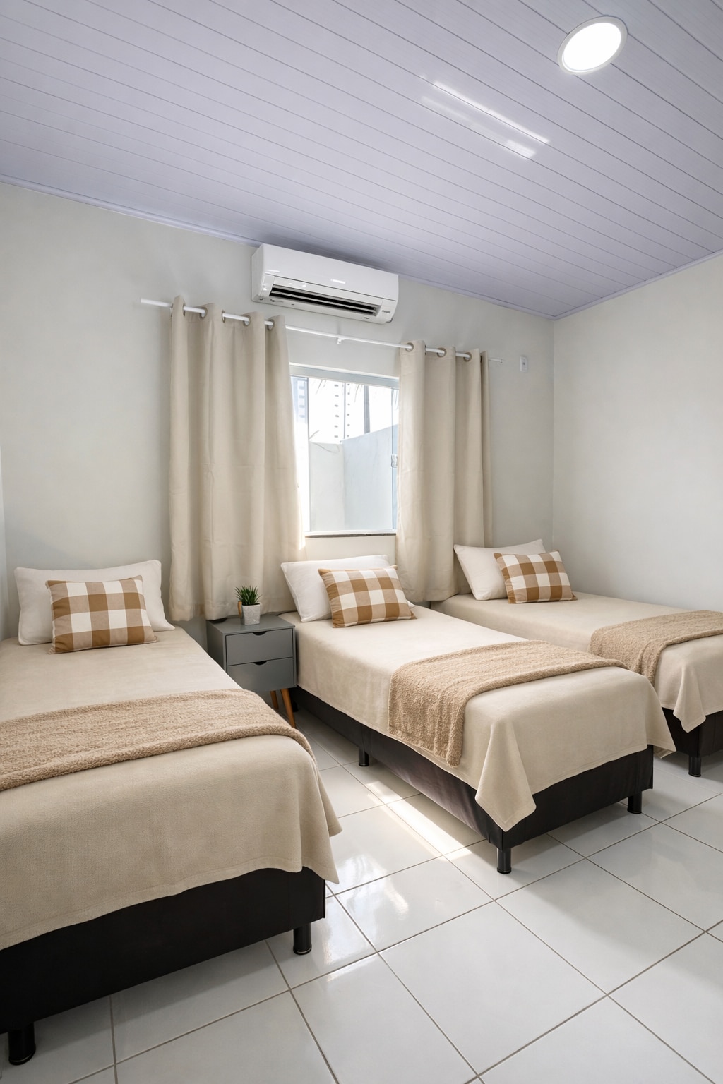 Large area, well located with security, served in the vicinity of restaurants, bakery and 350 meters from the Municipal Lake. It has two bedrooms, one with a queen and single bed and another with a double bed, two bathrooms, a spacious living room, and a kitchen with a barbecue grill. Amenities: Air Conditioning Bed Linen Bath Towels Personal hygiene kit Washing machines: dishes - clothes Iron Sandwich maker Microwave Pots Dishes Bowls Glasses and Jug Cutlery Blender