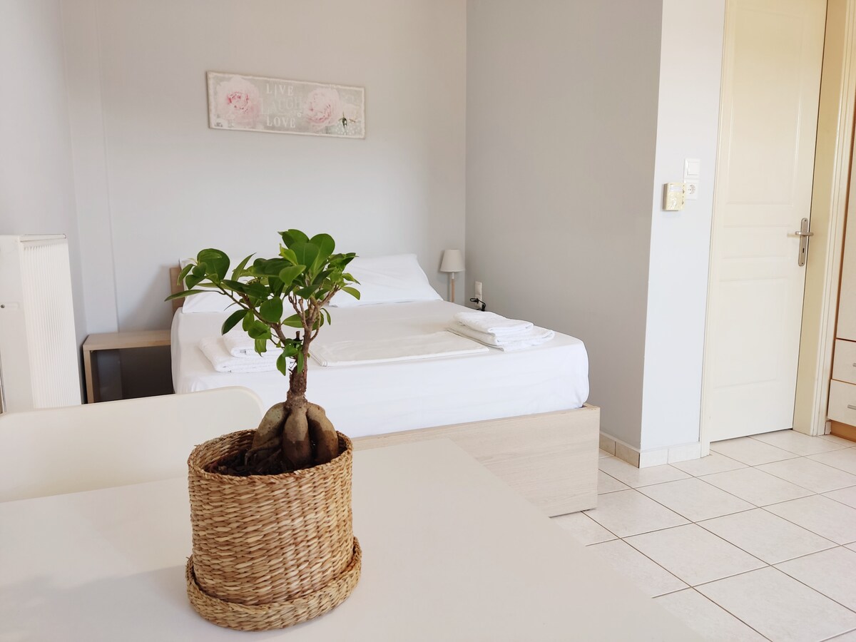 Our very recently renovated apartment is located on the ground floor of our detached house in Argostoli,in a quiet area ,only 500 m away from the main square. It is 25 m2, has a small separate kitchen room with all the amentities bathroom with a big shower, washing machine,smart tv and fantastic sea and town views. The views are provided both inside the bedroom with a very large window ,but also from our private shaded veranda.Free parking is available on the quiet public road