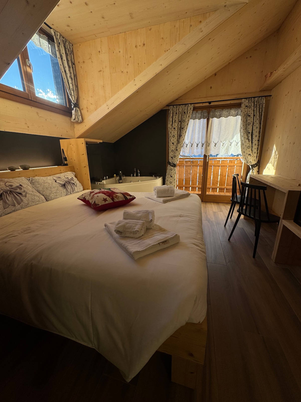 Mansarda open space, con angolo cottura. Immerso nel verde. Struttura con bio piscina esterna, sauna e jacuzzi, prima e dopo un tuffo nella neve. Disponibilità di area wellness & spa, su prenotazione ad un costo extra. Piscina idromassaggio, sauna, bagno turco, massaggi, trattamenti.