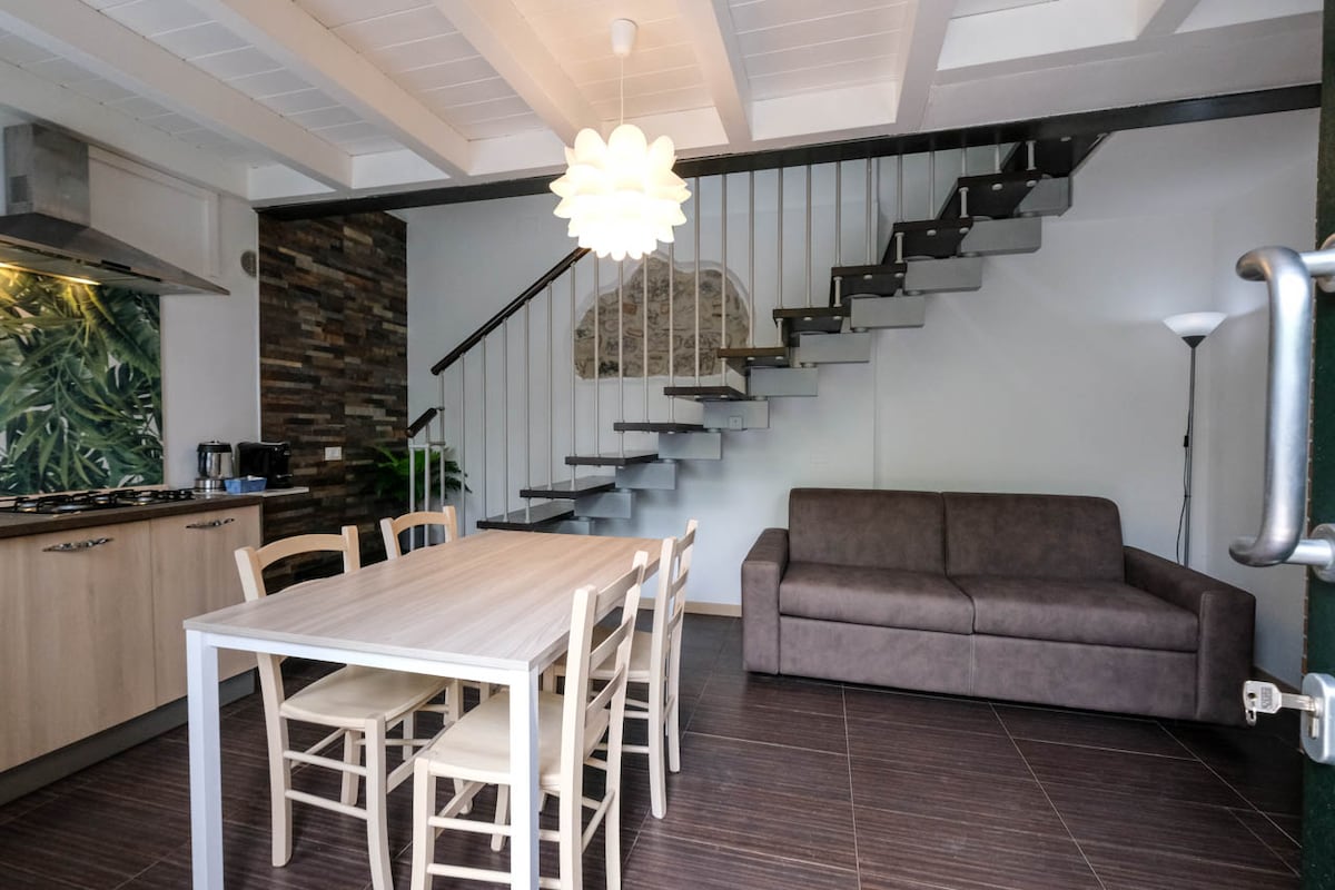 In the very central area, three minutes from the station, recently renovated period house with underfloor heating, air conditioning. The furniture is in an eclectic style with a mixture of antique furniture, current furniture, and minimal details. Functional and well-equipped, it also lends itself to long stays. Despite being inside a historic complex it has a private entrance, immersed in the greenery of a garden, it enjoys a parking space in the inner courtyard.