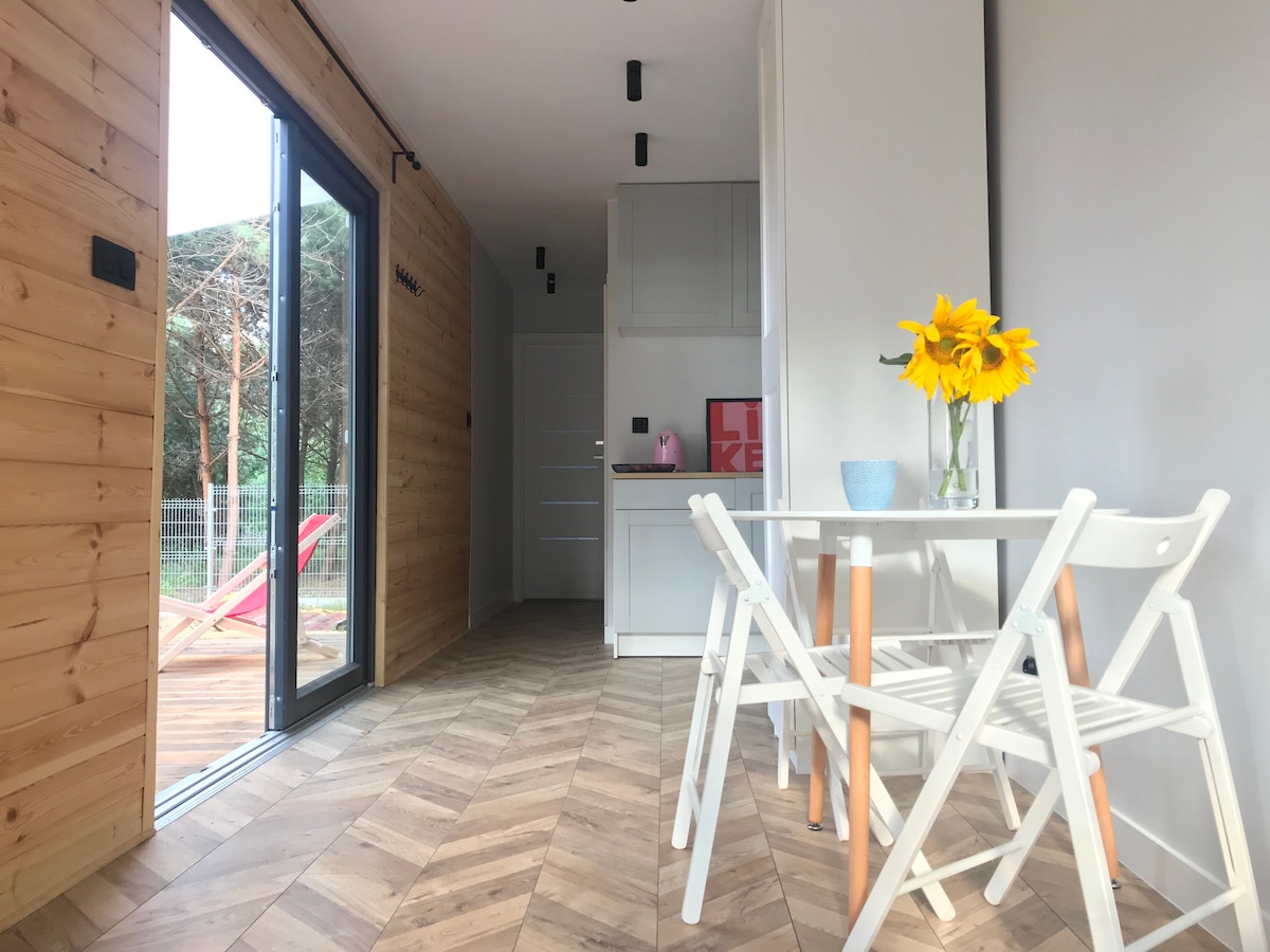 The sea containers are located in a small forest with a beautiful view of the quiet and peaceful Domaniowski Lagoon. For your comfort, each of the two containers is designed for one family or a group of up to four people. On the 25m2 area, we managed to separate a double bedroom, a toilet with a shower, a kitchen and a living room. In addition, each container has a terrace with sun loungers and blankets and a reading corner. There is also a separate area for a bonfire and a barbecue.