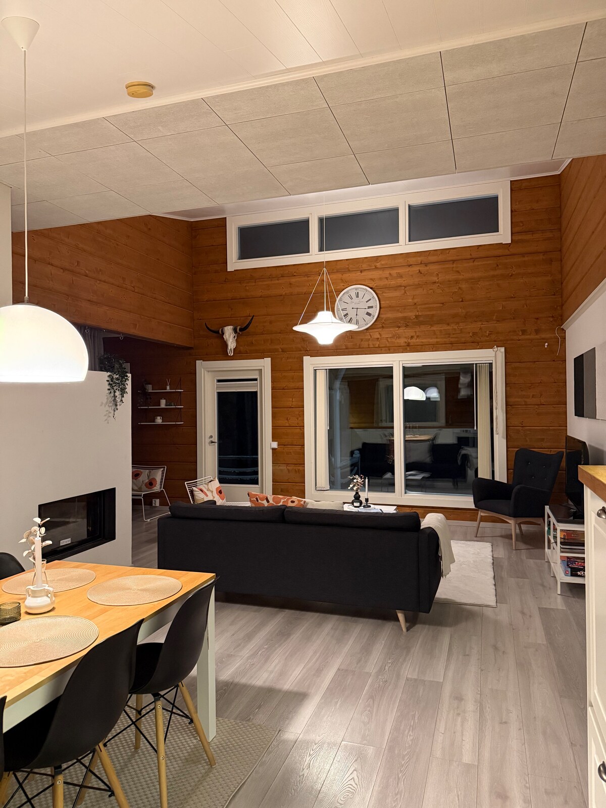 New VILLA SYÖTE! Located within walking distance of the slopes of Iso-syöte. The beds in the four bedrooms and the upstairs loft comfortably accommodate 8+2 people. The first floor of the villa has an open kitchen-living room, separate toilet, washroom, utility room, sauna and 2 bedrooms. In addition, the second floor has 2 bedrooms, a toilet and a hallway. The covered terrace has an outdoor jacuzzi. In summer, group table and gas grill. Airport: Rovaniemi 165 kilometers Oulu 154 kilometers