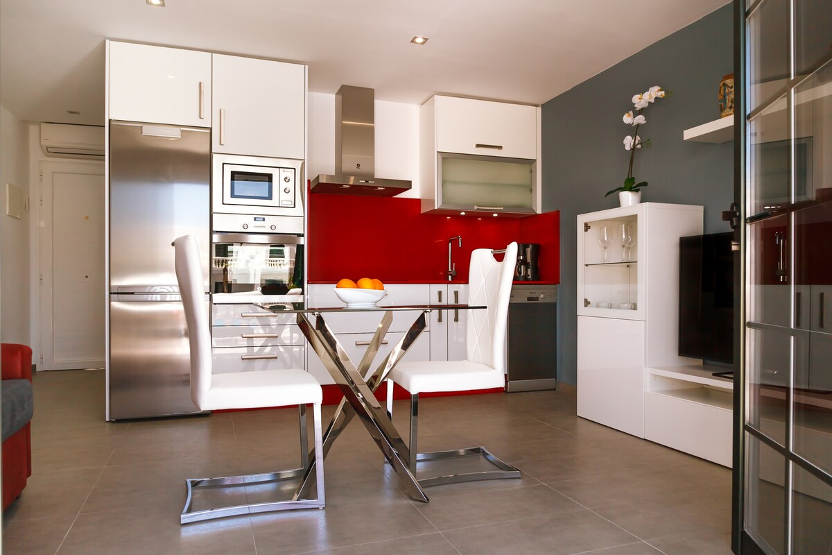 Apartment completely renovated in front of the pool with a nice style, you will find everything you need to enjoy a few days of rest, AIR CONDITIONING, dishwasher, microwave, oven, washing machine, Netflix, wifi, etc etc. Private urbanization near the main services of the town (bus, taxi, restaurants, supermarkets, beach). The beach is about 10 min walking, and a shopping center with the main shops about 5 min.