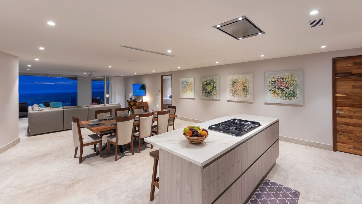 Luxurious 3000 sq ft condo with breathtaking oceanfront views, superior location in Conchas Chinas and full service amenities on site . It is the newest of the Sayan properties and a sought after address. The complex has an infinity rooftop pool, infinity lower pool, hot tub , full service bar and restaurant at both pools and a huge gym, massage and steam room available for all guests. The complex is a few steps to beach and a 15 min walk into Old Town. LOWER POOL CLOSED MAY 7-July 10