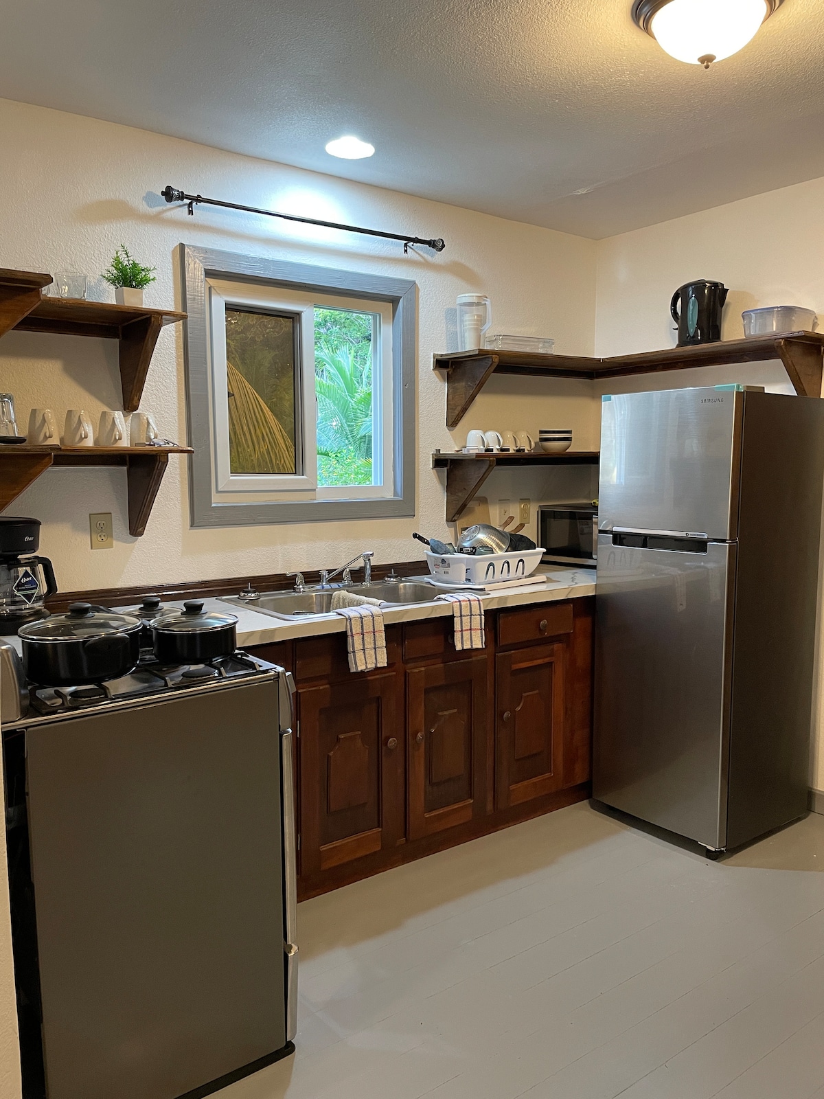 Relax and enjoy this unique and tranquil Tropical Island experience. Our Cabins are completely furnished with Hot water in shower, bath lavatory, and kitchen sink. Fully equipped kitchen with stove/oven, fridge, microwave, coffee pot, kettle, and more. In the living room there’s a very comfortable sectional sofa with coffee table, wifi and smart TV with cable channels. Enjoy the outdoor Palapa and BBQ pit for those special events. At the back of the cabin there’s an outdoor hot water shower.