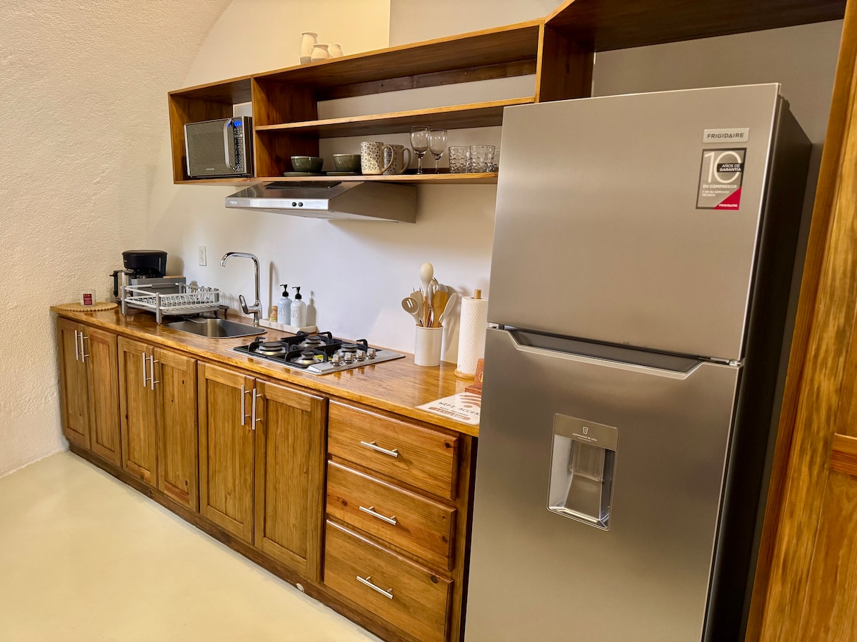 The apartment is in the MANURII Garden on the ground floor. A lush garden is around the apartment. Our cozy fire pit is just one step away. Our garden is full with fruits and flowers. We have a coffee machine at our bar which is available from 7am-10am free of charge. There are plenty of bars in Utila. Our bar is more a Meeting point and not with a bar tender all the time. But you have your own fridge at the Apartment.