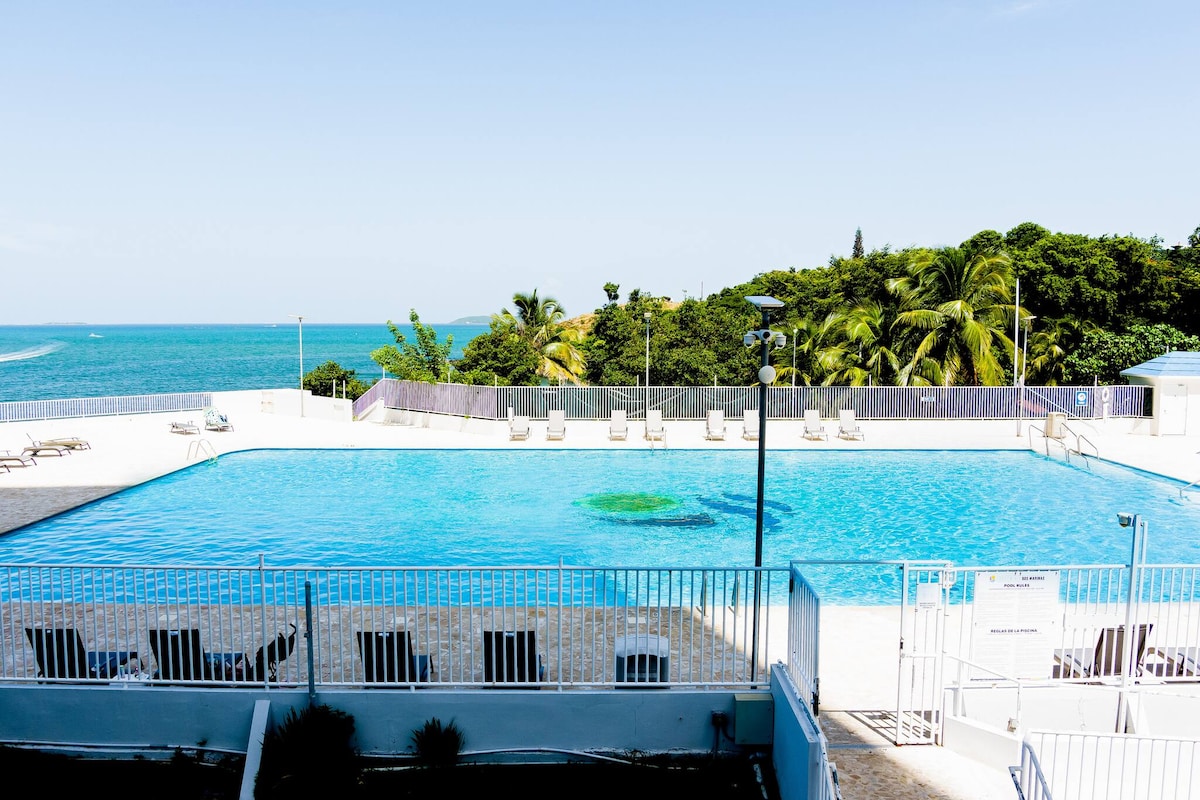 Welcome to Our Property at Dos Marinas I. Unwind at this oceanfront apartment. A million dollar view to icacos, culebra, Vieques and palomino from the balcony. This Apartment is a place for you to retreat, relax, reset and revive yourself. Located close to four marinas,shops and restaurants. The condo has a Olympic swimming pool, gazebos, basketball and tennis courts. A Fully Equipped bedroom with AC. Wake up to the Ocean breeze and sound. Note: Ac is only in the bedroom.