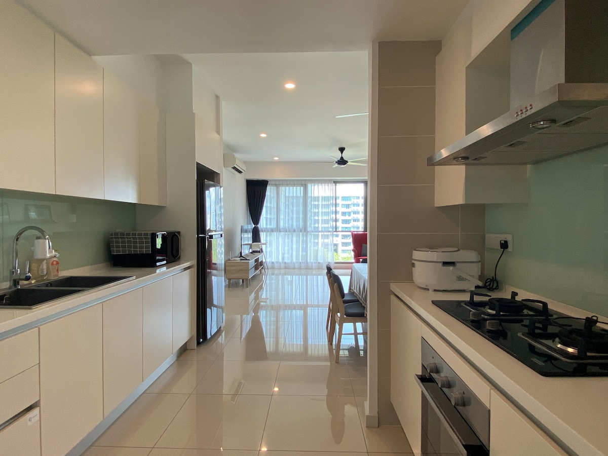 - 520 sqf build up area - 1 queen bed (Foldable mattress will be provided upon request) - Allocate with wardrobe in the room - Rain shower with water heater - 2 unit of air-conditioning - Flat screen smart TV - Sea view balcony Kitchen - Dining table with 4 dining chairs - Refrigerator and microwave - Electric kettle - Cooking hood and hob - Washing machine Car park - You can park anywhere at the basement at visitor parking Please take note that we only provide one access card and one key.