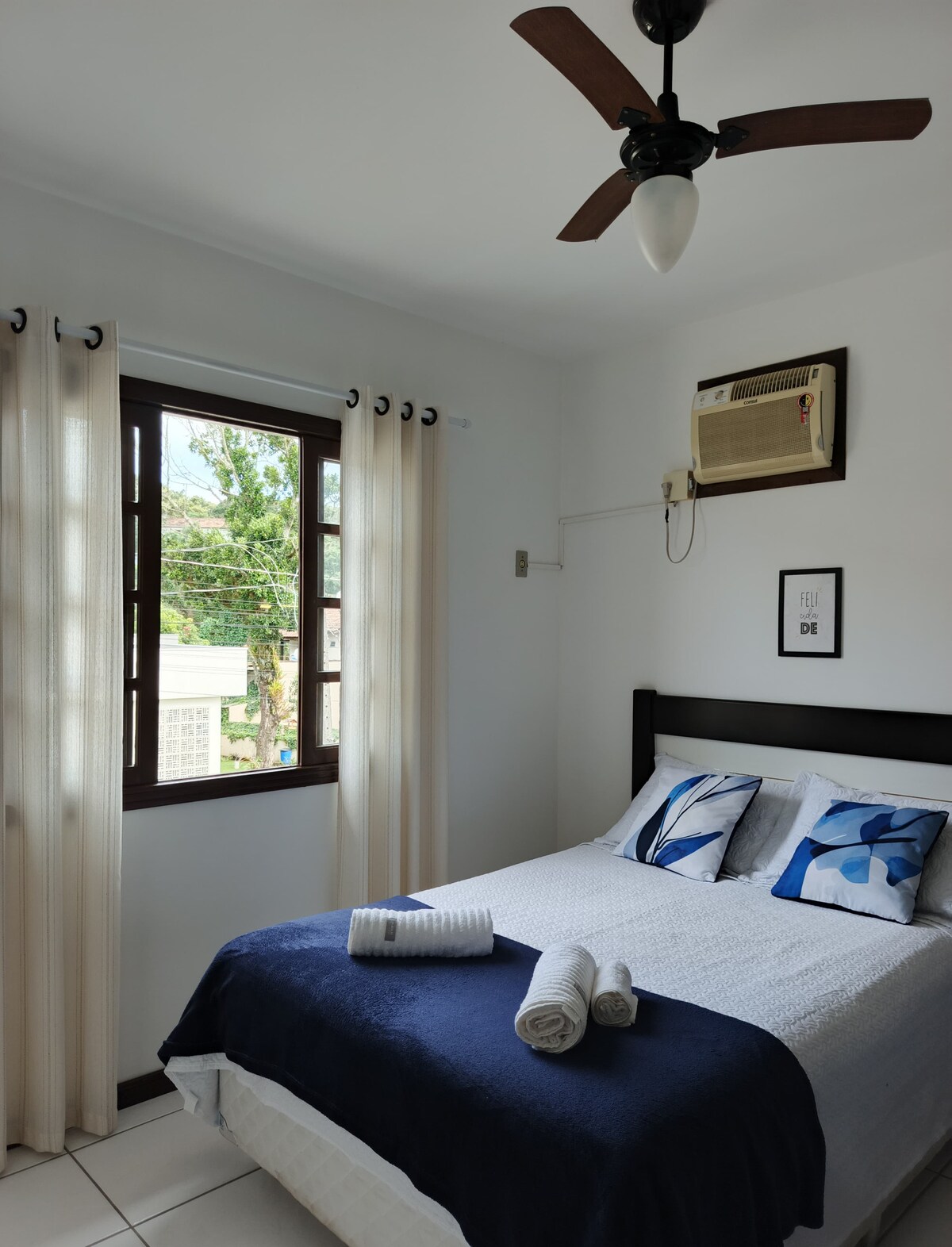 O Apartamento de um quarto em nossa residência é fresco e confortável, em ótima localização sobre rua pavimentada no centro da península de Canto Grande, a 500m. da praia de Mariscal por trilha ou 800m pela rua, e 800m. da praia de Morrinhos, rodeada de natureza ideal para um descanso em ambiente tranquilo.