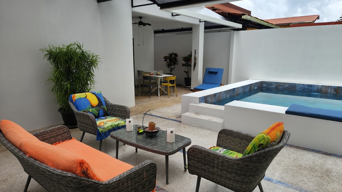 Uno de los primeros Airbnbs en Jaco, Beach Bungalow desde 2015 hospeda personas del mundo entero. "Un pedacito del paraíso" es como los huéspedes dicen en sus evaluaciones. Bungalow totalmente equipado, confortable, colchones nuevos, limpieza 5 estrellas durante esos 7 años y ubicado en una zona muy tranquila de Jaco, tan solo a 2 minutos en carro hacia la playa y centro. Local perfecto para descansar en familia o pareja y disfrutar de una encantadora piscina con catarata y jets de hidromasaje.